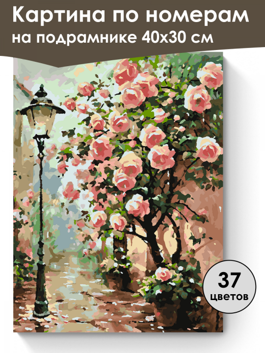 Картина по номерам на подрамнике, размер 40х30 см, произведена нами. Она включает 37 оттенков и 3145 контуров, что придаёт ей глубину цвета и плавные переходы. Картина выглядит более ярко и живо. В комплект входит глянцевый лак, которым можно покрыть работу по желанию. Краски имеют хорошую укрывистость, хватает двух проходов что бы закрасить символы на схеме. Так же они сохраняют текстуру мазков, не растекаясь и не разглаживаясь полностью на холсте. При покрытии глянцевым лаком создаётся эффект приближенный к масляной живописи. Краски упакованы герметично, что сохраняет их жидкими. Все необходимые инструменты для начала работы также включены в комплект, в том числе и крепления на стену. В картине используется крепкий подрамник со специальной вставкой, которая предотвращает провисание холста во время рисования. Это обеспечивает комфортный процесс работы и гарантирует, что холст всегда будет оставаться хорошо натянутым. Мы не используем экосольвентные чернила, которые содержат свинец и могут быть вредны для здоровья. Наши картины напечатаны безопасными водными пигментными чернилами, обеспечивающими чёткое изображение и легко читаемые обозначения. Холст плотный, имеет мелкую зернистость, легко разглаживается и устойчив к сминанию. Картина поставляется в защищённой бурой коробке. Живописный уличный пейзаж, где аллея с покрытием из плитки ведёт вдоль стены, украшенной густым кустом розовых роз; вдоль дорожки стоит старинный фонарь, создавая атмосферу спокойствия и романтики.