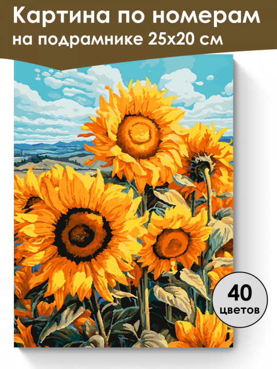 Картина по номерам на подрамнике, размер 25х20 см, произведена нами. Она включает 40 оттенков и 1582 контуров, что придаёт ей глубину цвета и плавные переходы. Картина выглядит более ярко и живо. В комплект входит глянцевый лак, которым можно покрыть работу по желанию. Краски имеют хорошую укрывистость, хватает двух проходов что бы закрасить символы на схеме. Так же они сохраняют текстуру мазков, не растекаясь и не разглаживаясь полностью на холсте. При покрытии глянцевым лаком создаётся эффект приближенный к масляной живописи. Краски упакованы герметично, что сохраняет их жидкими. Все необходимые инструменты для начала работы также включены в комплект, в том числе и крепления на стену. В картине используется крепкий подрамник со специальной вставкой, которая предотвращает провисание холста во время рисования. Это обеспечивает комфортный процесс работы и гарантирует, что холст всегда будет оставаться хорошо натянутым. Мы не используем экосольвентные чернила, которые содержат свинец и могут быть вредны для здоровья. Наши картины напечатаны безопасными водными пигментными чернилами, обеспечивающими чёткое изображение и легко читаемые обозначения. Холст плотный, имеет мелкую зернистость, легко разглаживается и устойчив к сминанию. Картина поставляется в защищённой бурой коробке. Яркие подсолнухи возвышаются на фоне живописного пейзажа с голубым небом и легкими облаками, простирающимися над холмами, создавая атмосферу тепла и красоты.