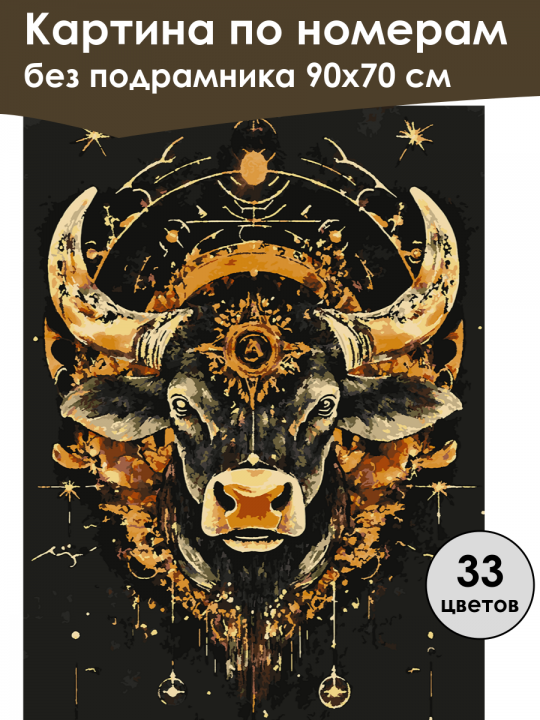 Картина по номерам без подрамника, размер 90х70 см, произведена нами. Она включает 33 оттенков и 4445 контуров, что придаёт ей глубину цвета и плавные переходы. Картина выглядит более ярко и живо. В комплект входит глянцевый лак, которым можно покрыть работу по желанию. Краски имеют хорошую укрывистость, хватает двух проходов что бы закрасить символы на схеме. Так же они сохраняют текстуру мазков, не растекаясь и не разглаживаясь полностью на холсте. При покрытии глянцевым лаком создаётся эффект приближенный к масляной живописи. Краски упакованы герметично, что сохраняет их жидкими. Все необходимые инструменты для начала работы также входят в комплект. Мы не используем экосольвентные чернила, которые содержат свинец и могут быть вредны для здоровья. Наши картины напечатаны безопасными водными пигментными чернилами, обеспечивающими чёткое изображение и легко читаемые обозначения. Холст плотный, имеет мелкую зернистость, легко разглаживается и устойчив к сминанию. Картина поставляется в защищённом буром тубусе. Следует отметить, что картина без подрамника её нельзя натянуть на подрамник из-за узких краёв, она предназначена для оформления в рамочку. Стилизованный портрет быка в этническом и космическом стиле; его рога оформлены в виде полумесяцев, а вокруг головы расположены звезды и другие астрономические элементы на темном фоне, создавая мистическую и монументальную атмосферу.