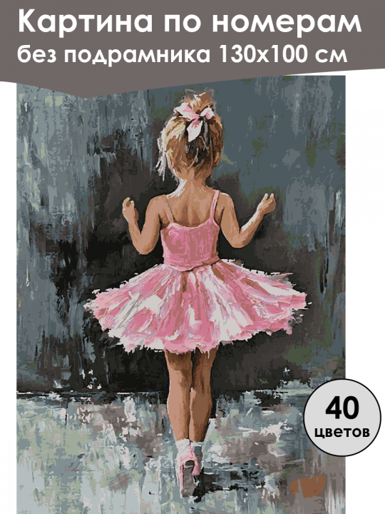 Картина по номерам без подрамника, размер 130х100 см, произведена нами. Она включает 40 оттенков и 5005 контуров, что придаёт ей глубину цвета и плавные переходы. Картина выглядит более ярко и живо. В комплект входит глянцевый лак, которым можно покрыть работу по желанию. Краски имеют хорошую укрывистость, хватает двух проходов что бы закрасить символы на схеме. Так же они сохраняют текстуру мазков, не растекаясь и не разглаживаясь полностью на холсте. При покрытии глянцевым лаком создаётся эффект приближенный к масляной живописи. Краски упакованы герметично, что сохраняет их жидкими. Все необходимые инструменты для начала работы также входят в комплект. Мы не используем экосольвентные чернила, которые содержат свинец и могут быть вредны для здоровья. Наши картины напечатаны безопасными водными пигментными чернилами, обеспечивающими чёткое изображение и легко читаемые обозначения. Холст плотный, имеет мелкую зернистость, легко разглаживается и устойчив к сминанию. Картина поставляется в защищённом буром тубусе. Следует отметить, что картина без подрамника её нельзя натянуть на подрамник из-за узких краёв, она предназначена для оформления в рамочку. Маленькая девочка в розовом балетном костюме, стоящая спиной к зрителю; она держит руки в стороны и, похоже, готовится к танцу, на фоне темного неоднородного фона, создающего ощущение сцены или студии.