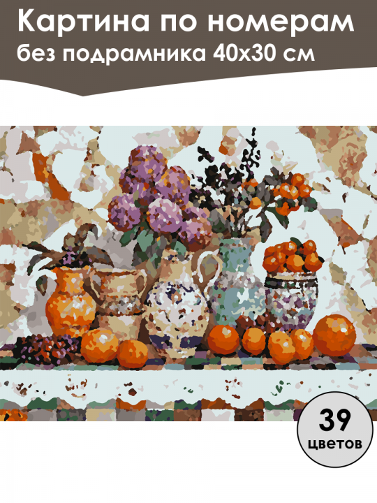 Картина по номерам без подрамника, размер 40х30 см, произведена нами. Она включает 39 оттенков и 2949 контуров, что придаёт ей глубину цвета и плавные переходы. Картина выглядит более ярко и живо. В комплект входит глянцевый лак, которым можно покрыть работу по желанию. Краски имеют хорошую укрывистость, хватает двух проходов что бы закрасить символы на схеме. Так же они сохраняют текстуру мазков, не растекаясь и не разглаживаясь полностью на холсте. При покрытии глянцевым лаком создаётся эффект приближенный к масляной живописи. Краски упакованы герметично, что сохраняет их жидкими. Все необходимые инструменты для начала работы также входят в комплект. Мы не используем экосольвентные чернила, которые содержат свинец и могут быть вредны для здоровья. Наши картины напечатаны безопасными водными пигментными чернилами, обеспечивающими чёткое изображение и легко читаемые обозначения. Холст плотный, имеет мелкую зернистость, легко разглаживается и устойчив к сминанию. Картина поставляется в бурой коробке. Следует отметить, что картина без подрамника её нельзя натянуть на подрамник из-за узких краёв, она предназначена для оформления в рамочку. Натюрмортная флорентийская композиция в стиле импрессионизма, на которой изображены вазы с цветами и фруктами; различные по форме и расцветке керамические ёмкости заполнены букетами сирени и ягодами, а на переднем плане лежат яркие апельсины; фон имеет абстрактные пятна тёплых, пастельных оттенков, создавая гармоничное и уютное настроение.