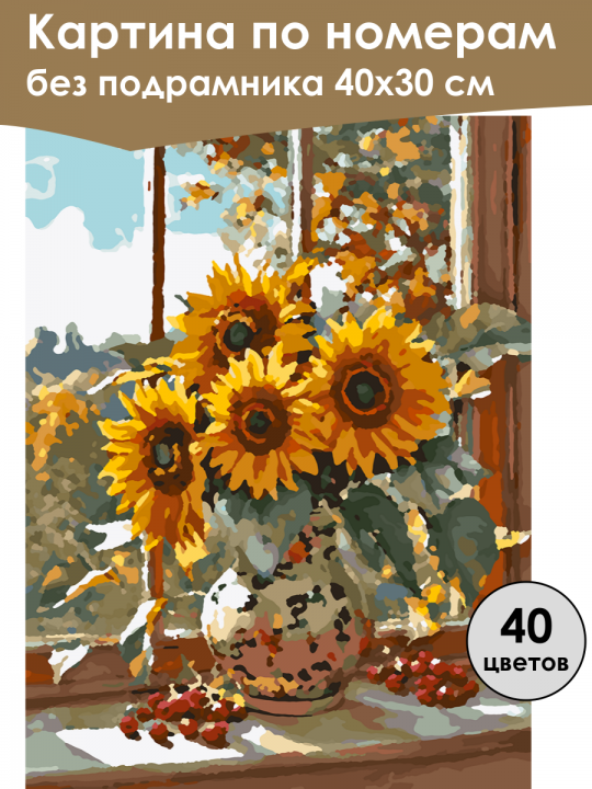 Картина по номерам без подрамника, размер 40х30 см, произведена нами. Она включает 40 оттенков и 2565 контуров, что придаёт ей глубину цвета и плавные переходы. Картина выглядит более ярко и живо. В комплект входит глянцевый лак, которым можно покрыть работу по желанию. Краски имеют хорошую укрывистость, хватает двух проходов что бы закрасить символы на схеме. Так же они сохраняют текстуру мазков, не растекаясь и не разглаживаясь полностью на холсте. При покрытии глянцевым лаком создаётся эффект приближенный к масляной живописи. Краски упакованы герметично, что сохраняет их жидкими. Все необходимые инструменты для начала работы также входят в комплект. Мы не используем экосольвентные чернила, которые содержат свинец и могут быть вредны для здоровья. Наши картины напечатаны безопасными водными пигментными чернилами, обеспечивающими чёткое изображение и легко читаемые обозначения. Холст плотный, имеет мелкую зернистость, легко разглаживается и устойчив к сминанию. Картина поставляется в бурой коробке. Следует отметить, что картина без подрамника её нельзя натянуть на подрамник из-за узких краёв, она предназначена для оформления в рамочку. Натюрморт с подсолнухами в вазе на фоне окна, за которым видно яркое осеннее пейзаж с золотыми листьями; картина выполнена в стиле масляной живописи с мягкими и плавными мазками, создающими уютную и тёплую атмосферу.