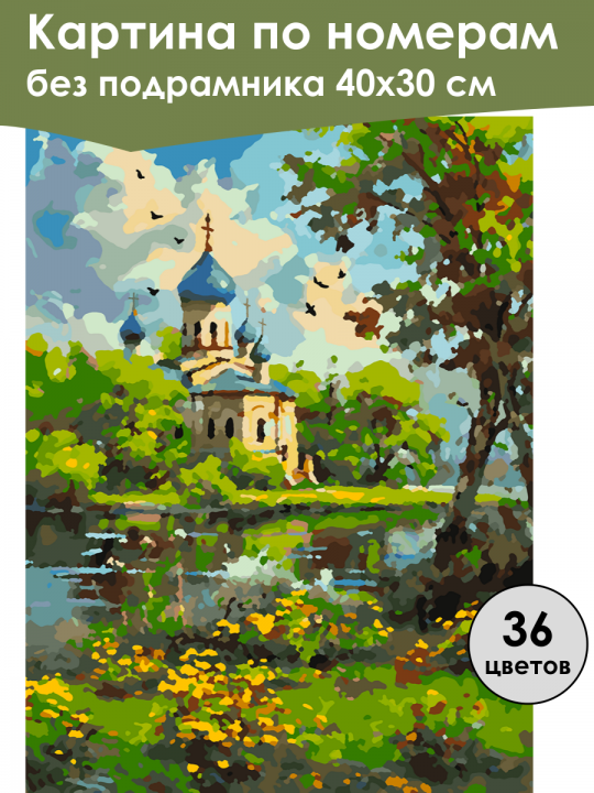Картина по номерам без подрамника, размер 40х30 см, произведена нами. Она включает 36 оттенков и 2668 контуров, что придаёт ей глубину цвета и плавные переходы. Картина выглядит более ярко и живо. В комплект входит глянцевый лак, которым можно покрыть работу по желанию. Краски имеют хорошую укрывистость, хватает двух проходов что бы закрасить символы на схеме. Так же они сохраняют текстуру мазков, не растекаясь и не разглаживаясь полностью на холсте. При покрытии глянцевым лаком создаётся эффект приближенный к масляной живописи. Краски упакованы герметично, что сохраняет их жидкими. Все необходимые инструменты для начала работы также входят в комплект. Мы не используем экосольвентные чернила, которые содержат свинец и могут быть вредны для здоровья. Наши картины напечатаны безопасными водными пигментными чернилами, обеспечивающими чёткое изображение и легко читаемые обозначения. Холст плотный, имеет мелкую зернистость, легко разглаживается и устойчив к сминанию. Картина поставляется в бурой коробке. Следует отметить, что картина без подрамника её нельзя натянуть на подрамник из-за узких краёв, она предназначена для оформления в рамочку. Пейзаж с церковью на берегу реки: на переднем плане яркие цветы и трава, справа дерево с густой листвой, на заднем плане церковь с синими куполами и крестами, окружённая зелёными деревьями, в небе летят птицы, а облака мягко очерчивают контуры здания, создавая ощущение спокойствия и гармонии.