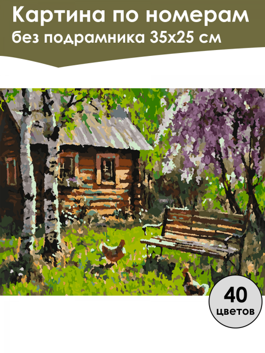Картина по номерам без подрамника, размер 35х25 см, произведена нами. Она включает 40 оттенков и 3259 контуров, что придаёт ей глубину цвета и плавные переходы. Картина выглядит более ярко и живо. В комплект входит глянцевый лак, которым можно покрыть работу по желанию. Краски качественные, имеют хорошую укрывистость, хватает двух проходов что бы закрасить символы на схеме. Они упакованы герметично, что сохраняет их жидкими. Все необходимые инструменты для начала работы также включены в комплект. Мы не используем экосольвентные чернила, которые содержат свинец и могут быть вредны для здоровья. Наши картины напечатаны безопасными водными пигментными чернилами, обеспечивающими чёткое изображение и легко читаемые обозначения. Холст плотный, имеет мелкую зернистость, легко разглаживается и устойчив к сминанию. Картина поставляется в защищённой бурой коробке. Следует отметить, что картина без подрамника её нельзя натянуть на подрамник из-за узких краёв, она предназначена для оформления в рамочку. Уютный сельский дворик с деревянным домом и металлической скамейкой на зелёной траве. Берёза и кусты с фиолетовыми цветами создают тень, а на переднем плане видно курицу, прогуливающуюся по траве. Солнечный день освещает всю сцену, придавая ей яркость и жизнерадостность.
