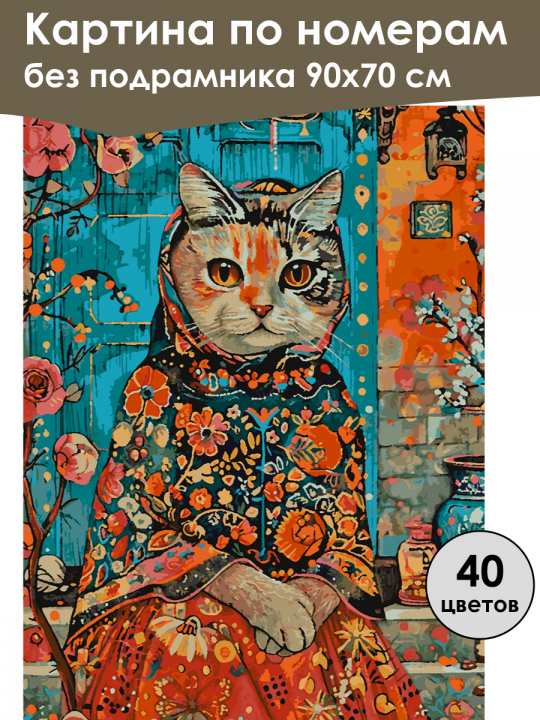 Картина по номерам без подрамника, размер 90х70 см, произведена нами. Она включает 40 оттенков и 7349 контуров, что придаёт ей глубину цвета и плавные переходы. Картина выглядит более ярко и живо. В комплект входит глянцевый лак, которым можно покрыть работу по желанию. Краски имеют хорошую укрывистость, хватает двух проходов что бы закрасить символы на схеме. Так же они сохраняют текстуру мазков, не растекаясь и не разглаживаясь полностью на холсте. При покрытии глянцевым лаком создаётся эффект приближенный к масляной живописи. Краски упакованы герметично, что сохраняет их жидкими. Все необходимые инструменты для начала работы также входят в комплект. Мы не используем экосольвентные чернила, которые содержат свинец и могут быть вредны для здоровья. Наши картины напечатаны безопасными водными пигментными чернилами, обеспечивающими чёткое изображение и легко читаемые обозначения. Холст плотный, имеет мелкую зернистость, легко разглаживается и устойчив к сминанию. Картина поставляется в защищённом буром тубусе. Следует отметить, что картина без подрамника её нельзя натянуть на подрамник из-за узких краёв, она предназначена для оформления в рамочку. Кошка с серьезным выражением морды, одетый в яркий платок, покрытый цветочным узором, сидящий на фоне насыщенно голубой стены с апельсиновыми элементами; композиция выполнена в стиле, напоминающем технику пэчворк, с акцентом на насыщенные цвета и контраст линии.