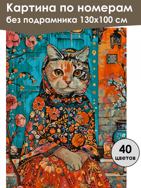 Картина по номерам без подрамника, размер 130х100 см, произведена нами. Она включает 40 оттенков и 7108 контуров, что придаёт ей глубину цвета и плавные переходы. Картина выглядит более ярко и живо. В комплект входит глянцевый лак, которым можно покрыть работу по желанию. Краски имеют хорошую укрывистость, хватает двух проходов что бы закрасить символы на схеме. Так же они сохраняют текстуру мазков, не растекаясь и не разглаживаясь полностью на холсте. При покрытии глянцевым лаком создаётся эффект приближенный к масляной живописи. Краски упакованы герметично, что сохраняет их жидкими. Все необходимые инструменты для начала работы также входят в комплект. Мы не используем экосольвентные чернила, которые содержат свинец и могут быть вредны для здоровья. Наши картины напечатаны безопасными водными пигментными чернилами, обеспечивающими чёткое изображение и легко читаемые обозначения. Холст плотный, имеет мелкую зернистость, легко разглаживается и устойчив к сминанию. Картина поставляется в защищённом буром тубусе. Следует отметить, что картина без подрамника её нельзя натянуть на подрамник из-за узких краёв, она предназначена для оформления в рамочку. Кошка с серьезным выражением морды, одетый в яркий платок, покрытый цветочным узором, сидящий на фоне насыщенно голубой стены с апельсиновыми элементами; композиция выполнена в стиле, напоминающем технику пэчворк, с акцентом на насыщенные цвета и контраст линии.