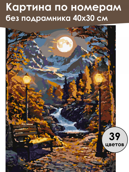 Картина по номерам без подрамника, размер 40х30 см, произведена нами. Она включает 39 оттенков и 3662 контуров, что придаёт ей глубину цвета и плавные переходы. Картина выглядит более ярко и живо. В комплект входит глянцевый лак, которым можно покрыть работу по желанию. Краски имеют хорошую укрывистость, хватает двух проходов что бы закрасить символы на схеме. Так же они сохраняют текстуру мазков, не растекаясь и не разглаживаясь полностью на холсте. При покрытии глянцевым лаком создаётся эффект приближенный к масляной живописи. Краски упакованы герметично, что сохраняет их жидкими. Все необходимые инструменты для начала работы также входят в комплект. Мы не используем экосольвентные чернила, которые содержат свинец и могут быть вредны для здоровья. Наши картины напечатаны безопасными водными пигментными чернилами, обеспечивающими чёткое изображение и легко читаемые обозначения. Холст плотный, имеет мелкую зернистость, легко разглаживается и устойчив к сминанию. Картина поставляется в бурой коробке. Следует отметить, что картина без подрамника её нельзя натянуть на подрамник из-за узких краёв, она предназначена для оформления в рамочку. Пейзаж в осенних тонах: в центре извилистая река с водопадом, окруженная деревьями с ярко-оранжевой листвой, на переднем плане скамейка и два фонаря, освещающие тропинку; на заднем фоне величественные горы покрыты снегом, вверху светит яркая луна в ясном вечернем небе.