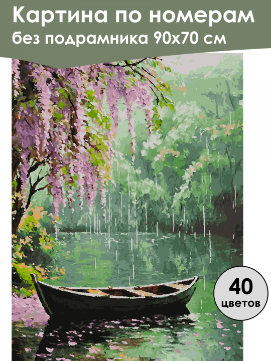 Картина по номерам без подрамника, размер 90х70 см, произведена нами. Она включает 40 оттенков и 6703 контуров, что придаёт ей глубину цвета и плавные переходы. Картина выглядит более ярко и живо. В комплект входит глянцевый лак, которым можно покрыть работу по желанию. Краски имеют хорошую укрывистость, хватает двух проходов что бы закрасить символы на схеме. Так же они сохраняют текстуру мазков, не растекаясь и не разглаживаясь полностью на холсте. При покрытии глянцевым лаком создаётся эффект приближенный к масляной живописи. Краски упакованы герметично, что сохраняет их жидкими. Все необходимые инструменты для начала работы также входят в комплект. Мы не используем экосольвентные чернила, которые содержат свинец и могут быть вредны для здоровья. Наши картины напечатаны безопасными водными пигментными чернилами, обеспечивающими чёткое изображение и легко читаемые обозначения. Холст плотный, имеет мелкую зернистость, легко разглаживается и устойчив к сминанию. Картина поставляется в защищённом буром тубусе. Следует отметить, что картина без подрамника её нельзя натянуть на подрамник из-за узких краёв, она предназначена для оформления в рамочку. Лодка покоится на зеркальной поверхности воды, окружённой густой растительностью, с ветвями деревьев, украшенными свисающими розовыми цветами, создавая атмосферу спокойствия и природной гармонии.