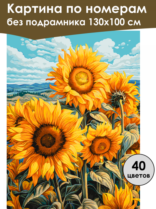 Картина по номерам без подрамника, размер 130х100 см, произведена нами. Она включает 40 оттенков и 5818 контуров, что придаёт ей глубину цвета и плавные переходы. Картина выглядит более ярко и живо. В комплект входит глянцевый лак, которым можно покрыть работу по желанию. Краски имеют хорошую укрывистость, хватает двух проходов что бы закрасить символы на схеме. Так же они сохраняют текстуру мазков, не растекаясь и не разглаживаясь полностью на холсте. При покрытии глянцевым лаком создаётся эффект приближенный к масляной живописи. Краски упакованы герметично, что сохраняет их жидкими. Все необходимые инструменты для начала работы также входят в комплект. Мы не используем экосольвентные чернила, которые содержат свинец и могут быть вредны для здоровья. Наши картины напечатаны безопасными водными пигментными чернилами, обеспечивающими чёткое изображение и легко читаемые обозначения. Холст плотный, имеет мелкую зернистость, легко разглаживается и устойчив к сминанию. Картина поставляется в защищённом буром тубусе. Следует отметить, что картина без подрамника её нельзя натянуть на подрамник из-за узких краёв, она предназначена для оформления в рамочку. Яркие подсолнухи возвышаются на фоне живописного пейзажа с голубым небом и легкими облаками, простирающимися над холмами, создавая атмосферу тепла и красоты.