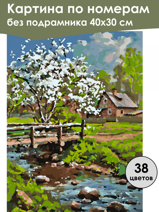 Картина по номерам без подрамника, размер 40х30 см, произведена нами. Она включает 38 оттенков и 3471 контуров, что придаёт ей глубину цвета и плавные переходы. Картина выглядит более ярко и живо. В комплект входит глянцевый лак, которым можно покрыть работу по желанию. Краски имеют хорошую укрывистость, хватает двух проходов что бы закрасить символы на схеме. Так же они сохраняют текстуру мазков, не растекаясь и не разглаживаясь полностью на холсте. При покрытии глянцевым лаком создаётся эффект приближенный к масляной живописи. Краски упакованы герметично, что сохраняет их жидкими. Все необходимые инструменты для начала работы также входят в комплект. Мы не используем экосольвентные чернила, которые содержат свинец и могут быть вредны для здоровья. Наши картины напечатаны безопасными водными пигментными чернилами, обеспечивающими чёткое изображение и легко читаемые обозначения. Холст плотный, имеет мелкую зернистость, легко разглаживается и устойчив к сминанию. Картина поставляется в бурой коробке. Следует отметить, что картина без подрамника её нельзя натянуть на подрамник из-за узких краёв, она предназначена для оформления в рамочку. Живописный сельский пейзаж с домиком на фоне, окружённым ярко-зелёной травой и цветущим деревом с белыми цветами, перед которым протекает небольшой ручей с каменистым дном, а через него перекинут деревянный мостик под ясным синим небом с редкими облаками.