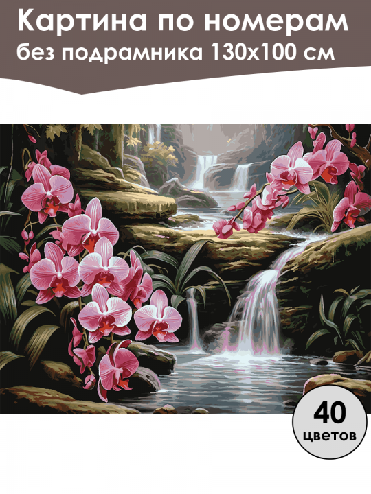 Картина по номерам без подрамника, размер 130х100 см, произведена нами. Она включает 40 оттенков и 6053 контуров, что придаёт ей глубину цвета и плавные переходы. Картина выглядит более ярко и живо. В комплект входит глянцевый лак, которым можно покрыть работу по желанию. Краски имеют хорошую укрывистость, хватает двух проходов что бы закрасить символы на схеме. Так же они сохраняют текстуру мазков, не растекаясь и не разглаживаясь полностью на холсте. При покрытии глянцевым лаком создаётся эффект приближенный к масляной живописи. Краски упакованы герметично, что сохраняет их жидкими. Все необходимые инструменты для начала работы также входят в комплект. Мы не используем экосольвентные чернила, которые содержат свинец и могут быть вредны для здоровья. Наши картины напечатаны безопасными водными пигментными чернилами, обеспечивающими чёткое изображение и легко читаемые обозначения. Холст плотный, имеет мелкую зернистость, легко разглаживается и устойчив к сминанию. Картина поставляется в защищённом буром тубусе. Следует отметить, что картина без подрамника её нельзя натянуть на подрамник из-за узких краёв, она предназначена для оформления в рамочку. Живописный пейзаж с каскадными водопадами, окружёнными насыщенной зеленью, по краям которых растут яркие розовые орхидеи, создавая гармоничную и спокойную атмосферу.