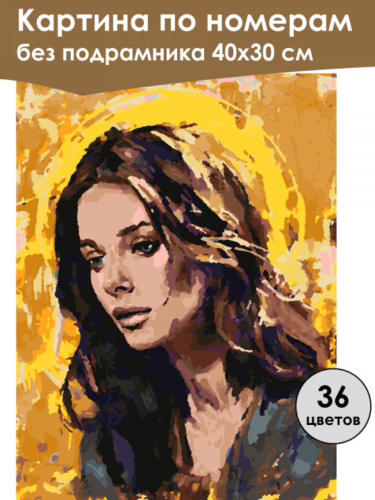 Картина по номерам без подрамника, размер 40х30 см, произведена нами. Она включает 36 оттенков и 2547 контуров, что придаёт ей глубину цвета и плавные переходы. Картина выглядит более ярко и живо. В комплект входит глянцевый лак, которым можно покрыть работу по желанию. Краски имеют хорошую укрывистость, хватает двух проходов что бы закрасить символы на схеме. Так же они сохраняют текстуру мазков, не растекаясь и не разглаживаясь полностью на холсте. При покрытии глянцевым лаком создаётся эффект приближенный к масляной живописи. Краски упакованы герметично, что сохраняет их жидкими. Все необходимые инструменты для начала работы также входят в комплект. Мы не используем экосольвентные чернила, которые содержат свинец и могут быть вредны для здоровья. Наши картины напечатаны безопасными водными пигментными чернилами, обеспечивающими чёткое изображение и легко читаемые обозначения. Холст плотный, имеет мелкую зернистость, легко разглаживается и устойчив к сминанию. Картина поставляется в бурой коробке. Следует отметить, что картина без подрамника её нельзя натянуть на подрамник из-за узких краёв, она предназначена для оформления в рамочку. Портрет женщины с длинными волосами на фоне желтого ореола, выполненный в ярких и насыщенных цветах, придающих картине эффект текстуры и глубины; ее взгляд несколько направлен вниз, создавая задумчивое и меланхоличное настроение.