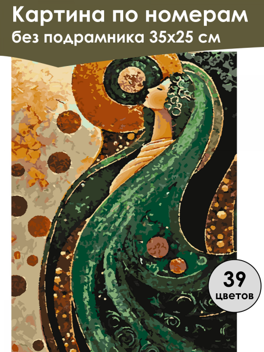 Картина по номерам без подрамника, размер 35х25 см, произведена нами. Она включает 39 оттенков и 2030 контуров, что придаёт ей глубину цвета и плавные переходы. Картина выглядит более ярко и живо. В комплект входит глянцевый лак, которым можно покрыть работу по желанию. Краски качественные, имеют хорошую укрывистость, хватает двух проходов что бы закрасить символы на схеме. Они упакованы герметично, что сохраняет их жидкими. Все необходимые инструменты для начала работы также включены в комплект. Мы не используем экосольвентные чернила, которые содержат свинец и могут быть вредны для здоровья. Наши картины напечатаны безопасными водными пигментными чернилами, обеспечивающими чёткое изображение и легко читаемые обозначения. Холст плотный, имеет мелкую зернистость, легко разглаживается и устойчив к сминанию. Картина поставляется в защищённой бурой коробке. Следует отметить, что картина без подрамника её нельзя натянуть на подрамник из-за узких краёв, она предназначена для оформления в рамочку. Абстрактная картина с элементами, напоминающими ар-нуво; в центре композиции расположена женская фигура с волнистыми, похожими на водоросли зелёными волосами, а фон заполнен круглыми узорами и плавными линиями в оттенках коричневого и зелёного.