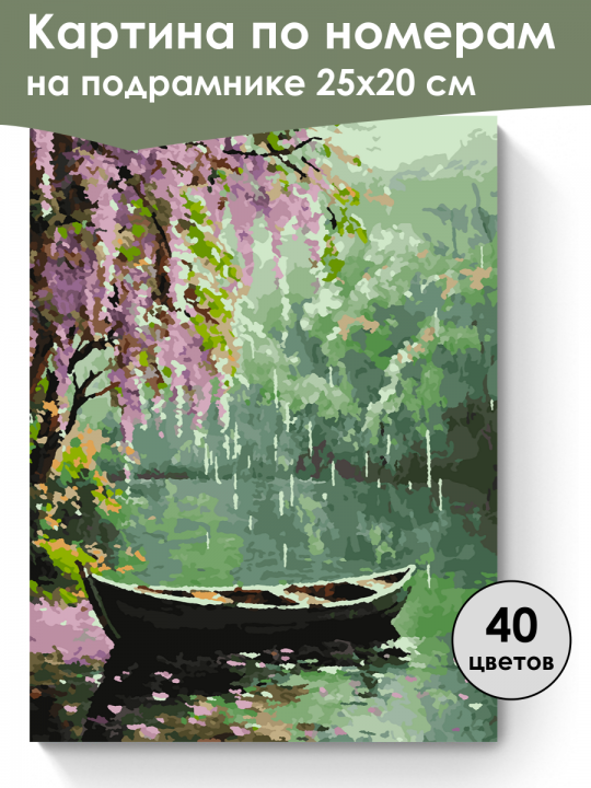 Картина по номерам на подрамнике, размер 25х20 см, произведена нами. Она включает 40 оттенков и 1520 контуров, что придаёт ей глубину цвета и плавные переходы. Картина выглядит более ярко и живо. В комплект входит глянцевый лак, которым можно покрыть работу по желанию. Краски имеют хорошую укрывистость, хватает двух проходов что бы закрасить символы на схеме. Так же они сохраняют текстуру мазков, не растекаясь и не разглаживаясь полностью на холсте. При покрытии глянцевым лаком создаётся эффект приближенный к масляной живописи. Краски упакованы герметично, что сохраняет их жидкими. Все необходимые инструменты для начала работы также включены в комплект, в том числе и крепления на стену. В картине используется крепкий подрамник со специальной вставкой, которая предотвращает провисание холста во время рисования. Это обеспечивает комфортный процесс работы и гарантирует, что холст всегда будет оставаться хорошо натянутым. Мы не используем экосольвентные чернила, которые содержат свинец и могут быть вредны для здоровья. Наши картины напечатаны безопасными водными пигментными чернилами, обеспечивающими чёткое изображение и легко читаемые обозначения. Холст плотный, имеет мелкую зернистость, легко разглаживается и устойчив к сминанию. Картина поставляется в защищённой бурой коробке. Лодка покоится на зеркальной поверхности воды, окружённой густой растительностью, с ветвями деревьев, украшенными свисающими розовыми цветами, создавая атмосферу спокойствия и природной гармонии.