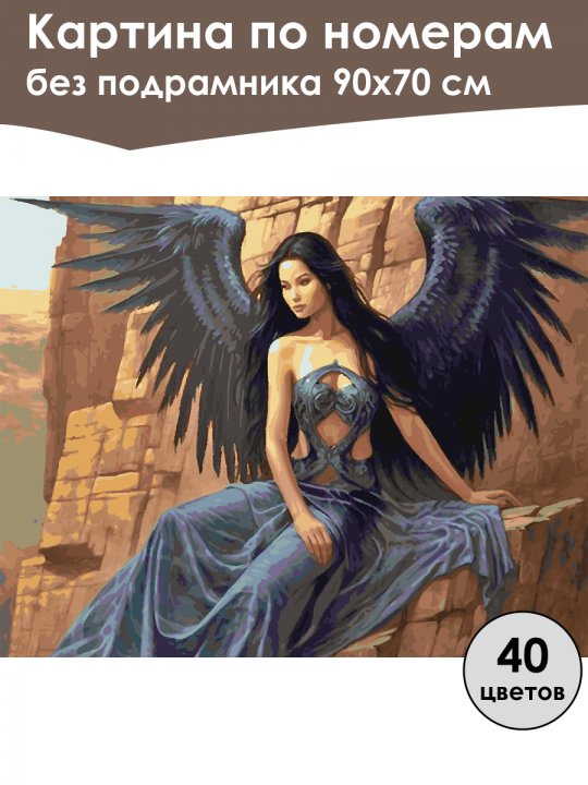 Картина по номерам без подрамника, размер 90х70 см, произведена нами. Она включает 40 оттенков и 4490 контуров, что придаёт ей глубину цвета и плавные переходы. Картина выглядит более ярко и живо. В комплект входит глянцевый лак, которым можно покрыть работу по желанию. Краски имеют хорошую укрывистость, хватает двух проходов что бы закрасить символы на схеме. Так же они сохраняют текстуру мазков, не растекаясь и не разглаживаясь полностью на холсте. При покрытии глянцевым лаком создаётся эффект приближенный к масляной живописи. Краски упакованы герметично, что сохраняет их жидкими. Все необходимые инструменты для начала работы также входят в комплект. Мы не используем экосольвентные чернила, которые содержат свинец и могут быть вредны для здоровья. Наши картины напечатаны безопасными водными пигментными чернилами, обеспечивающими чёткое изображение и легко читаемые обозначения. Холст плотный, имеет мелкую зернистость, легко разглаживается и устойчив к сминанию. Картина поставляется в защищённом буром тубусе. Следует отметить, что картина без подрамника её нельзя натянуть на подрамник из-за узких краёв, она предназначена для оформления в рамочку. Девушка-ангел с длинными тёмными волосами и чёрными крыльями, сидящая на фоне скал; она одета в элегантное платье тёмно-синего цвета, которое гармонирует с оттенками крыльев, создавая атмосферу фантастики и мистики.