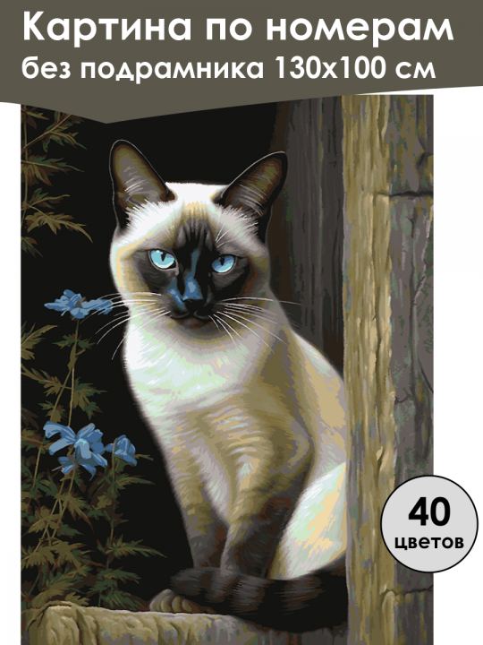 Картина по номерам без подрамника, размер 130х100 см, произведена нами. Она включает 40 оттенков и 4268 контуров, что придаёт ей глубину цвета и плавные переходы. Картина выглядит более ярко и живо. В комплект входит глянцевый лак, которым можно покрыть работу по желанию. Краски имеют хорошую укрывистость, хватает двух проходов что бы закрасить символы на схеме. Так же они сохраняют текстуру мазков, не растекаясь и не разглаживаясь полностью на холсте. При покрытии глянцевым лаком создаётся эффект приближенный к масляной живописи. Краски упакованы герметично, что сохраняет их жидкими. Все необходимые инструменты для начала работы также входят в комплект. Мы не используем экосольвентные чернила, которые содержат свинец и могут быть вредны для здоровья. Наши картины напечатаны безопасными водными пигментными чернилами, обеспечивающими чёткое изображение и легко читаемые обозначения. Холст плотный, имеет мелкую зернистость, легко разглаживается и устойчив к сминанию. Картина поставляется в защищённом буром тубусе. Следует отметить, что картина без подрамника её нельзя натянуть на подрамник из-за узких краёв, она предназначена для оформления в рамочку. Сиамская кошка с ярко-голубыми глазами, сидящую у деревянного столба; у нее тёмная морда, лапы и уши, а фон украшен нежными голубыми цветами и зеленью.