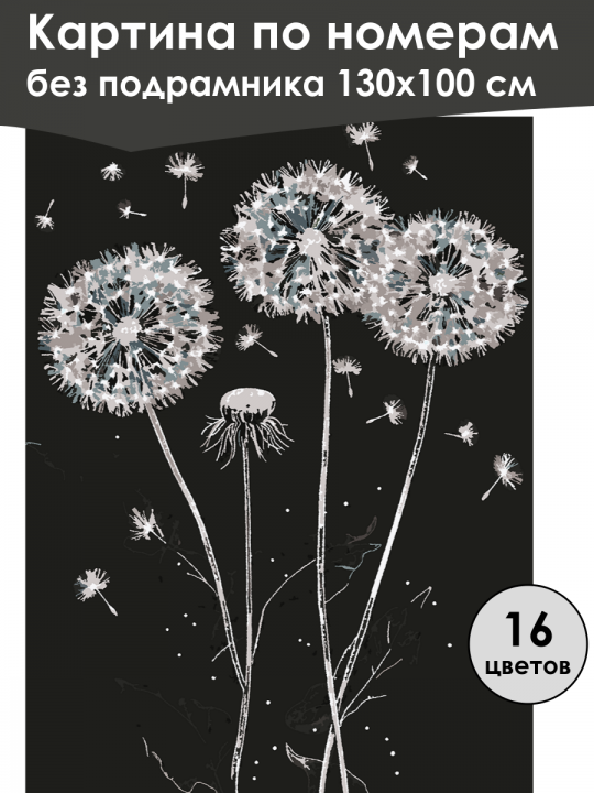 Картина по номерам без подрамника, размер 130х100 см, произведена нами. Она включает 16 оттенков и 1470 контуров, что придаёт ей глубину цвета и плавные переходы. Картина выглядит более ярко и живо. В комплект входит глянцевый лак, которым можно покрыть работу по желанию. Краски имеют хорошую укрывистость, хватает двух проходов что бы закрасить символы на схеме. Так же они сохраняют текстуру мазков, не растекаясь и не разглаживаясь полностью на холсте. При покрытии глянцевым лаком создаётся эффект приближенный к масляной живописи. Краски упакованы герметично, что сохраняет их жидкими. Все необходимые инструменты для начала работы также входят в комплект. Мы не используем экосольвентные чернила, которые содержат свинец и могут быть вредны для здоровья. Наши картины напечатаны безопасными водными пигментными чернилами, обеспечивающими чёткое изображение и легко читаемые обозначения. Холст плотный, имеет мелкую зернистость, легко разглаживается и устойчив к сминанию. Картина поставляется в защищённом буром тубусе. Следует отметить, что картина без подрамника её нельзя натянуть на подрамник из-за узких краёв, она предназначена для оформления в рамочку. Три одуванчика с белыми пушистыми сферическими головками и тонкими стеблями, на тёмном фоне. Вокруг них парят отдельные летающие семена, создавая динамический эффект разлетания. Линии стеблей и очертания листьев нарисованы светлыми штрихами, добавляя изображению художественный шарм и воздушность.