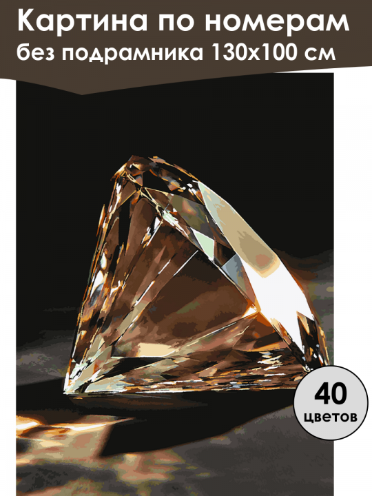 Картина по номерам без подрамника, размер 130х100 см, произведена нами. Она включает 40 оттенков и 2469 контуров, что придаёт ей глубину цвета и плавные переходы. Картина выглядит более ярко и живо. В комплект входит глянцевый лак, которым можно покрыть работу по желанию. Краски имеют хорошую укрывистость, хватает двух проходов что бы закрасить символы на схеме. Так же они сохраняют текстуру мазков, не растекаясь и не разглаживаясь полностью на холсте. При покрытии глянцевым лаком создаётся эффект приближенный к масляной живописи. Краски упакованы герметично, что сохраняет их жидкими. Все необходимые инструменты для начала работы также входят в комплект. Мы не используем экосольвентные чернила, которые содержат свинец и могут быть вредны для здоровья. Наши картины напечатаны безопасными водными пигментными чернилами, обеспечивающими чёткое изображение и легко читаемые обозначения. Холст плотный, имеет мелкую зернистость, легко разглаживается и устойчив к сминанию. Картина поставляется в защищённом буром тубусе. Следует отметить, что картина без подрамника её нельзя натянуть на подрамник из-за узких краёв, она предназначена для оформления в рамочку. Крупный бриллиант треугольной формы с яркими гранями и коричневыми оттенками, лежащий на тёмной поверхности, отражающей его блеск, а фон выполнен в глубоком чёрном цвете.