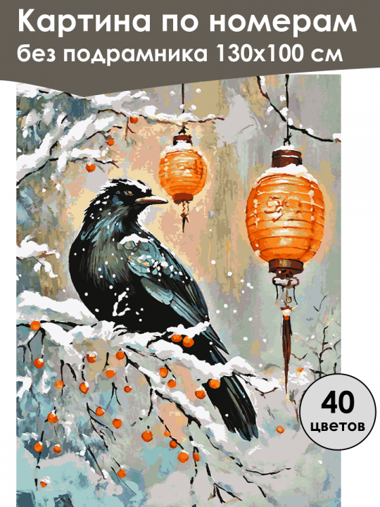 Картина по номерам без подрамника, размер 130х100 см, произведена нами. Она включает 40 оттенков и 4805 контуров, что придаёт ей глубину цвета и плавные переходы. Картина выглядит более ярко и живо. В комплект входит глянцевый лак, которым можно покрыть работу по желанию. Краски имеют хорошую укрывистость, хватает двух проходов что бы закрасить символы на схеме. Так же они сохраняют текстуру мазков, не растекаясь и не разглаживаясь полностью на холсте. При покрытии глянцевым лаком создаётся эффект приближенный к масляной живописи. Краски упакованы герметично, что сохраняет их жидкими. Все необходимые инструменты для начала работы также входят в комплект. Мы не используем экосольвентные чернила, которые содержат свинец и могут быть вредны для здоровья. Наши картины напечатаны безопасными водными пигментными чернилами, обеспечивающими чёткое изображение и легко читаемые обозначения. Холст плотный, имеет мелкую зернистость, легко разглаживается и устойчив к сминанию. Картина поставляется в защищённом буром тубусе. Следует отметить, что картина без подрамника её нельзя натянуть на подрамник из-за узких краёв, она предназначена для оформления в рамочку. Крупная чёрная птица сидит на заснеженной ветке, украшенной красными ягодами, рядом висят яркие оранжевые фонари, создающие тёплое свечение на фоне зимнего пейзажа.