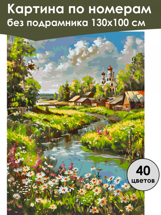 Картина по номерам без подрамника, размер 130х100 см, произведена нами. Она включает 40 оттенков и 7128 контуров, что придаёт ей глубину цвета и плавные переходы. Картина выглядит более ярко и живо. В комплект входит глянцевый лак, которым можно покрыть работу по желанию. Краски имеют хорошую укрывистость, хватает двух проходов что бы закрасить символы на схеме. Так же они сохраняют текстуру мазков, не растекаясь и не разглаживаясь полностью на холсте. При покрытии глянцевым лаком создаётся эффект приближенный к масляной живописи. Краски упакованы герметично, что сохраняет их жидкими. Все необходимые инструменты для начала работы также входят в комплект. Мы не используем экосольвентные чернила, которые содержат свинец и могут быть вредны для здоровья. Наши картины напечатаны безопасными водными пигментными чернилами, обеспечивающими чёткое изображение и легко читаемые обозначения. Холст плотный, имеет мелкую зернистость, легко разглаживается и устойчив к сминанию. Картина поставляется в защищённом буром тубусе. Следует отметить, что картина без подрамника её нельзя натянуть на подрамник из-за узких краёв, она предназначена для оформления в рамочку. Живописный сельский пейзаж: спокойная река окружена цветущими лугами, вдалеке видны деревья и крыши деревенских домов, на горизонте возвышается церковь с куполами, небо укрыто облаками.