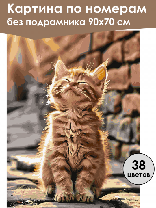 Картина по номерам без подрамника, размер 90х70 см, произведена нами. Она включает 38 оттенков и 4980 контуров, что придаёт ей глубину цвета и плавные переходы. Картина выглядит более ярко и живо. В комплект входит глянцевый лак, которым можно покрыть работу по желанию. Краски имеют хорошую укрывистость, хватает двух проходов что бы закрасить символы на схеме. Так же они сохраняют текстуру мазков, не растекаясь и не разглаживаясь полностью на холсте. При покрытии глянцевым лаком создаётся эффект приближенный к масляной живописи. Краски упакованы герметично, что сохраняет их жидкими. Все необходимые инструменты для начала работы также входят в комплект. Мы не используем экосольвентные чернила, которые содержат свинец и могут быть вредны для здоровья. Наши картины напечатаны безопасными водными пигментными чернилами, обеспечивающими чёткое изображение и легко читаемые обозначения. Холст плотный, имеет мелкую зернистость, легко разглаживается и устойчив к сминанию. Картина поставляется в защищённом буром тубусе. Следует отметить, что картина без подрамника её нельзя натянуть на подрамник из-за узких краёв, она предназначена для оформления в рамочку. Рыжий котёнок сидит на солнечной улице, задрав голову вверх и прищурив глаза, фон размытый, тёплые оттенки создают уютное настроение.