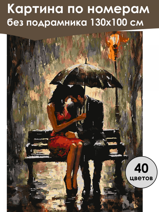 Картина по номерам без подрамника, размер 130х100 см, произведена нами. Она включает 40 оттенков и 5225 контуров, что придаёт ей глубину цвета и плавные переходы. Картина выглядит более ярко и живо. В комплект входит глянцевый лак, которым можно покрыть работу по желанию. Краски имеют хорошую укрывистость, хватает двух проходов что бы закрасить символы на схеме. Так же они сохраняют текстуру мазков, не растекаясь и не разглаживаясь полностью на холсте. При покрытии глянцевым лаком создаётся эффект приближенный к масляной живописи. Краски упакованы герметично, что сохраняет их жидкими. Все необходимые инструменты для начала работы также входят в комплект. Мы не используем экосольвентные чернила, которые содержат свинец и могут быть вредны для здоровья. Наши картины напечатаны безопасными водными пигментными чернилами, обеспечивающими чёткое изображение и легко читаемые обозначения. Холст плотный, имеет мелкую зернистость, легко разглаживается и устойчив к сминанию. Картина поставляется в защищённом буром тубусе. Следует отметить, что картина без подрамника её нельзя натянуть на подрамник из-за узких краёв, она предназначена для оформления в рамочку. Пара сидит на скамейке под зонтом в дождь. Вокруг сумеречная атмосфера, освещённая тёплым светом уличного фонаря. Мужчина и женщина, близко друг к другу, создают романтическую обстановку, фиксируя мгновение уюта и защищённости от стихии.