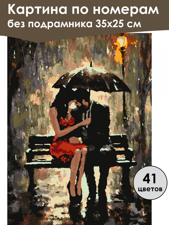 Картина по номерам без подрамника, размер 35х25 см, произведена нами. Она включает 41 оттенков и 2531 контуров, что придаёт ей глубину цвета и плавные переходы. Картина выглядит более ярко и живо. В комплект входит глянцевый лак, которым можно покрыть работу по желанию. Краски качественные, имеют хорошую укрывистость, хватает двух проходов что бы закрасить символы на схеме. Они упакованы герметично, что сохраняет их жидкими. Все необходимые инструменты для начала работы также включены в комплект. Мы не используем экосольвентные чернила, которые содержат свинец и могут быть вредны для здоровья. Наши картины напечатаны безопасными водными пигментными чернилами, обеспечивающими чёткое изображение и легко читаемые обозначения. Холст плотный, имеет мелкую зернистость, легко разглаживается и устойчив к сминанию. Картина поставляется в защищённой бурой коробке. Следует отметить, что картина без подрамника её нельзя натянуть на подрамник из-за узких краёв, она предназначена для оформления в рамочку. Пара сидит на скамейке под зонтом в дождь. Вокруг сумеречная атмосфера, освещённая тёплым светом уличного фонаря. Мужчина и женщина, близко друг к другу, создают романтическую обстановку, фиксируя мгновение уюта и защищённости от стихии.