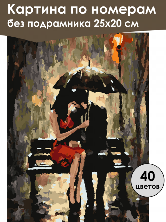 Картина по номерам без подрамника, размер 25х20 см, произведена нами. Она включает 40 оттенков и 1405 контуров, что придаёт ей глубину цвета и плавные переходы. Картина выглядит более ярко и живо. В комплект входит глянцевый лак, которым можно покрыть работу по желанию. Краски качественные, имеют хорошую укрывистость, хватает двух проходов что бы закрасить символы на схеме. Они упакованы герметично, что сохраняет их жидкими. Все необходимые инструменты для начала работы также включены в комплект. Мы не используем экосольвентные чернила, которые содержат свинец и могут быть вредны для здоровья. Наши картины напечатаны безопасными водными пигментными чернилами, обеспечивающими чёткое изображение и легко читаемые обозначения. Холст плотный, имеет мелкую зернистость, легко разглаживается и устойчив к сминанию. Картина поставляется в бурой коробке. Следует отметить, что картина без подрамника её нельзя натянуть на подрамник из-за узких краёв, она предназначена для оформления в рамочку. Пара сидит на скамейке под зонтом в дождь. Вокруг сумеречная атмосфера, освещённая тёплым светом уличного фонаря. Мужчина и женщина, близко друг к другу, создают романтическую обстановку, фиксируя мгновение уюта и защищённости от стихии.