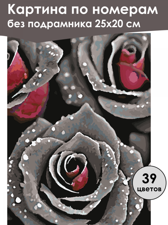 Картина по номерам без подрамника, размер 25х20 см, произведена нами. Она включает 39 оттенков и 1307 контуров, что придаёт ей глубину цвета и плавные переходы. Картина выглядит более ярко и живо. В комплект входит глянцевый лак, которым можно покрыть работу по желанию. Краски качественные, имеют хорошую укрывистость, хватает двух проходов что бы закрасить символы на схеме. Они упакованы герметично, что сохраняет их жидкими. Все необходимые инструменты для начала работы также включены в комплект. Мы не используем экосольвентные чернила, которые содержат свинец и могут быть вредны для здоровья. Наши картины напечатаны безопасными водными пигментными чернилами, обеспечивающими чёткое изображение и легко читаемые обозначения. Холст плотный, имеет мелкую зернистость, легко разглаживается и устойчив к сминанию. Картина поставляется в бурой коробке. Следует отметить, что картина без подрамника её нельзя натянуть на подрамник из-за узких краёв, она предназначена для оформления в рамочку. Крупным планом три черно-серые розы с каплями воды или инеем на лепестках, контрастно выделяющимся на фоне чёрного, с заметными красными оттенками в центре.