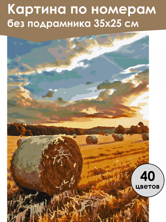 Картина по номерам без подрамника, размер 35х25 см, произведена нами. Она включает 40 оттенков и 1826 контуров, что придаёт ей глубину цвета и плавные переходы. Картина выглядит более ярко и живо. В комплект входит глянцевый лак, которым можно покрыть работу по желанию. Краски качественные, имеют хорошую укрывистость, хватает двух проходов что бы закрасить символы на схеме. Они упакованы герметично, что сохраняет их жидкими. Все необходимые инструменты для начала работы также включены в комплект. Мы не используем экосольвентные чернила, которые содержат свинец и могут быть вредны для здоровья. Наши картины напечатаны безопасными водными пигментными чернилами, обеспечивающими чёткое изображение и легко читаемые обозначения. Холст плотный, имеет мелкую зернистость, легко разглаживается и устойчив к сминанию. Картина поставляется в защищённой бурой коробке. Следует отметить, что картина без подрамника её нельзя натянуть на подрамник из-за узких краёв, она предназначена для оформления в рамочку. Поле с тюками сена под ярким закатным небом, облака окрашены в теплые оттенки, создавая атмосферу покоя и уюта.