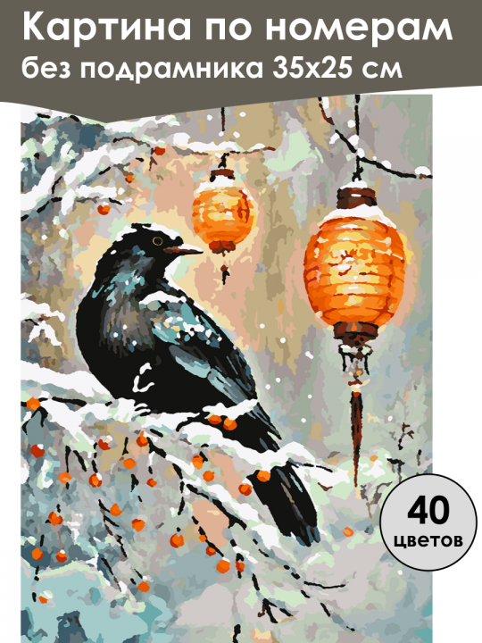 Картина по номерам без подрамника, размер 35х25 см, произведена нами. Она включает 40 оттенков и 2134 контуров, что придаёт ей глубину цвета и плавные переходы. Картина выглядит более ярко и живо. В комплект входит глянцевый лак, которым можно покрыть работу по желанию. Краски качественные, имеют хорошую укрывистость, хватает двух проходов что бы закрасить символы на схеме. Они упакованы герметично, что сохраняет их жидкими. Все необходимые инструменты для начала работы также включены в комплект. Мы не используем экосольвентные чернила, которые содержат свинец и могут быть вредны для здоровья. Наши картины напечатаны безопасными водными пигментными чернилами, обеспечивающими чёткое изображение и легко читаемые обозначения. Холст плотный, имеет мелкую зернистость, легко разглаживается и устойчив к сминанию. Картина поставляется в защищённой бурой коробке. Следует отметить, что картина без подрамника её нельзя натянуть на подрамник из-за узких краёв, она предназначена для оформления в рамочку. Крупная чёрная птица сидит на заснеженной ветке, украшенной красными ягодами, рядом висят яркие оранжевые фонари, создающие тёплое свечение на фоне зимнего пейзажа.
