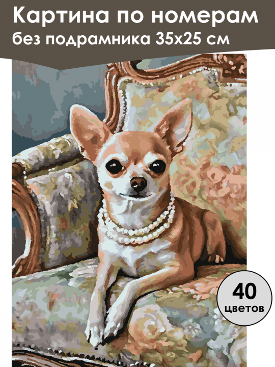 Картина по номерам без подрамника, размер 35х25 см, произведена нами. Она включает 40 оттенков и 2675 контуров, что придаёт ей глубину цвета и плавные переходы. Картина выглядит более ярко и живо. В комплект входит глянцевый лак, которым можно покрыть работу по желанию. Краски качественные, имеют хорошую укрывистость, хватает двух проходов что бы закрасить символы на схеме. Они упакованы герметично, что сохраняет их жидкими. Все необходимые инструменты для начала работы также включены в комплект. Мы не используем экосольвентные чернила, которые содержат свинец и могут быть вредны для здоровья. Наши картины напечатаны безопасными водными пигментными чернилами, обеспечивающими чёткое изображение и легко читаемые обозначения. Холст плотный, имеет мелкую зернистость, легко разглаживается и устойчив к сминанию. Картина поставляется в защищённой бурой коробке. Следует отметить, что картина без подрамника её нельзя натянуть на подрамник из-за узких краёв, она предназначена для оформления в рамочку. Собака породы чихуахуа, сидящая на винтажном кресле с изогнутой деревянной спинкой и обивкой пастельных оттенков; собака украшена несколькими жемчужными ожерельями и смотрит прямо перед собой.