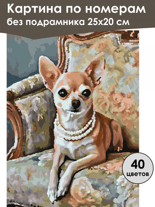 Картина по номерам без подрамника, размер 25х20 см, произведена нами. Она включает 40 оттенков и 1650 контуров, что придаёт ей глубину цвета и плавные переходы. Картина выглядит более ярко и живо. В комплект входит глянцевый лак, которым можно покрыть работу по желанию. Краски качественные, имеют хорошую укрывистость, хватает двух проходов что бы закрасить символы на схеме. Они упакованы герметично, что сохраняет их жидкими. Все необходимые инструменты для начала работы также включены в комплект. Мы не используем экосольвентные чернила, которые содержат свинец и могут быть вредны для здоровья. Наши картины напечатаны безопасными водными пигментными чернилами, обеспечивающими чёткое изображение и легко читаемые обозначения. Холст плотный, имеет мелкую зернистость, легко разглаживается и устойчив к сминанию. Картина поставляется в бурой коробке. Следует отметить, что картина без подрамника её нельзя натянуть на подрамник из-за узких краёв, она предназначена для оформления в рамочку. Собака породы чихуахуа, сидящая на винтажном кресле с изогнутой деревянной спинкой и обивкой пастельных оттенков; собака украшена несколькими жемчужными ожерельями и смотрит прямо перед собой.
