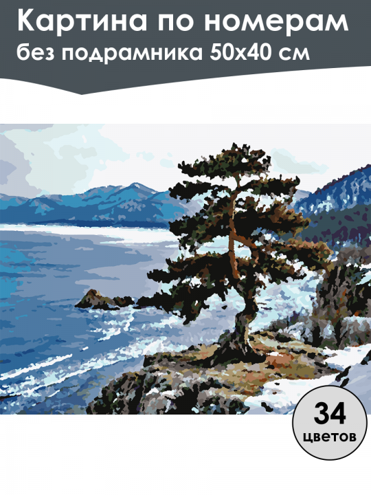 Картина по номерам без подрамника, размер 50х40 см, произведена нами. Она включает 34 оттенков и 2367 контуров, что придаёт ей глубину цвета и плавные переходы. Картина выглядит более ярко и живо. В комплект входит глянцевый лак, которым можно покрыть работу по желанию. Краски имеют хорошую укрывистость, хватает двух проходов что бы закрасить символы на схеме. Так же они сохраняют текстуру мазков, не растекаясь и не разглаживаясь полностью на холсте. При покрытии глянцевым лаком создаётся эффект приближенный к масляной живописи. Краски упакованы герметично, что сохраняет их жидкими. Все необходимые инструменты для начала работы также входят в комплект. Мы не используем экосольвентные чернила, которые содержат свинец и могут быть вредны для здоровья. Наши картины напечатаны безопасными водными пигментными чернилами, обеспечивающими чёткое изображение и легко читаемые обозначения. Холст плотный, имеет мелкую зернистость, легко разглаживается и устойчив к сминанию. Картина поставляется в бурой коробке. Следует отметить, что картина без подрамника её нельзя натянуть на подрамник из-за узких краёв, она предназначена для оформления в рамочку. Цифровая картина, напоминающая акварель, изображающая береговую линию с выступающими скалами и одиноким деревом на переднем плане; на заднем плане видны спокойные синие воды и горы с заснеженными вершинами под светлым облачным небом.
