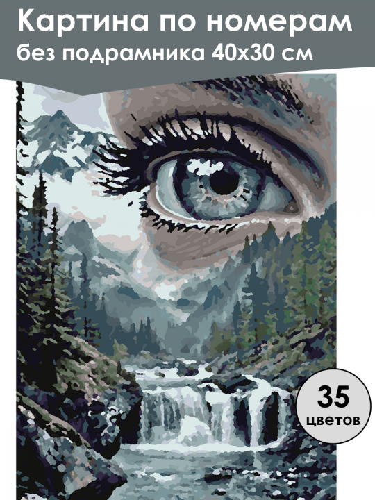 Картина по номерам без подрамника, размер 40х30 см, произведена нами. Она включает 35 оттенков и 3475 контуров, что придаёт ей глубину цвета и плавные переходы. Картина выглядит более ярко и живо. В комплект входит глянцевый лак, которым можно покрыть работу по желанию. Краски имеют хорошую укрывистость, хватает двух проходов что бы закрасить символы на схеме. Так же они сохраняют текстуру мазков, не растекаясь и не разглаживаясь полностью на холсте. При покрытии глянцевым лаком создаётся эффект приближенный к масляной живописи. Краски упакованы герметично, что сохраняет их жидкими. Все необходимые инструменты для начала работы также входят в комплект. Мы не используем экосольвентные чернила, которые содержат свинец и могут быть вредны для здоровья. Наши картины напечатаны безопасными водными пигментными чернилами, обеспечивающими чёткое изображение и легко читаемые обозначения. Холст плотный, имеет мелкую зернистость, легко разглаживается и устойчив к сминанию. Картина поставляется в бурой коробке. Следует отметить, что картина без подрамника её нельзя натянуть на подрамник из-за узких краёв, она предназначена для оформления в рамочку. Сюрреалистическая композиция, где крупный план человеческого глаза гармонично сочетается с фоном горного пейзажа, включающего заснеженные вершины, густой лес и бурный водопад, создавая эффект иллюзии.