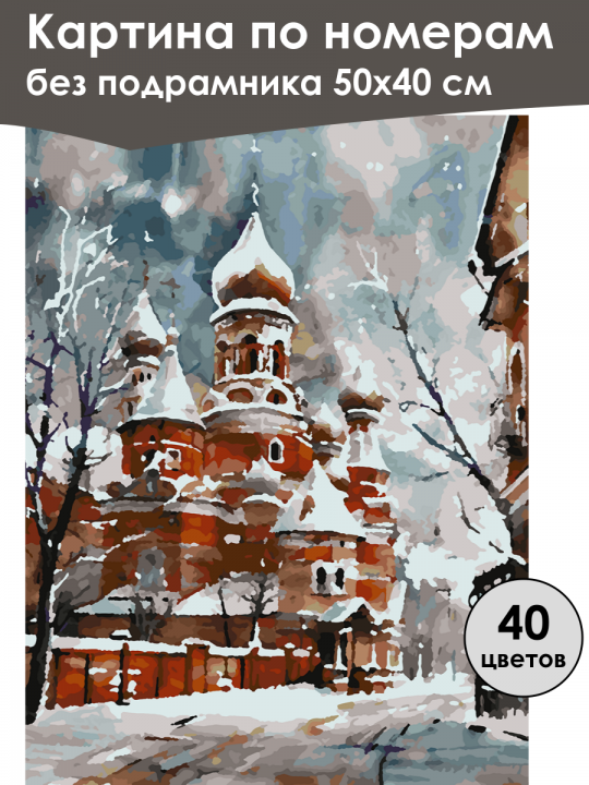 Картина по номерам без подрамника, размер 50х40 см, произведена нами. Она включает 40 оттенков и 3076 контуров, что придаёт ей глубину цвета и плавные переходы. Картина выглядит более ярко и живо. В комплект входит глянцевый лак, которым можно покрыть работу по желанию. Краски имеют хорошую укрывистость, хватает двух проходов что бы закрасить символы на схеме. Так же они сохраняют текстуру мазков, не растекаясь и не разглаживаясь полностью на холсте. При покрытии глянцевым лаком создаётся эффект приближенный к масляной живописи. Краски упакованы герметично, что сохраняет их жидкими. Все необходимые инструменты для начала работы также входят в комплект. Мы не используем экосольвентные чернила, которые содержат свинец и могут быть вредны для здоровья. Наши картины напечатаны безопасными водными пигментными чернилами, обеспечивающими чёткое изображение и легко читаемые обозначения. Холст плотный, имеет мелкую зернистость, легко разглаживается и устойчив к сминанию. Картина поставляется в бурой коробке. Следует отметить, что картина без подрамника её нельзя натянуть на подрамник из-за узких краёв, она предназначена для оформления в рамочку. Зимняя сцена с куполами храма, покрытыми снегом, на фоне туманных небес и обнажённых деревьев; стены здания окрашены в красноватые оттенки, создавая теплый контраст с холодными белыми снегами, покрывающими тротуар и узорчатый забор.