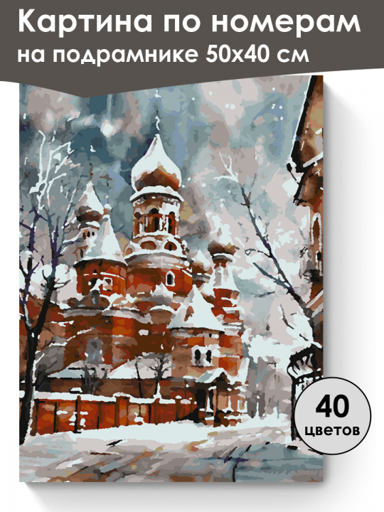 Картина по номерам на подрамнике, размер 50х40 см, произведена нами. Она включает 40 оттенков и 3076 контуров, что придаёт ей глубину цвета и плавные переходы. Картина выглядит более ярко и живо. В комплект входит глянцевый лак, которым можно покрыть работу по желанию. Краски имеют хорошую укрывистость, хватает двух проходов что бы закрасить символы на схеме. Так же они сохраняют текстуру мазков, не растекаясь и не разглаживаясь полностью на холсте. При покрытии глянцевым лаком создаётся эффект приближенный к масляной живописи. Краски упакованы герметично, что сохраняет их жидкими. Все необходимые инструменты для начала работы также включены в комплект, в том числе и крепления на стену. В картине используется крепкий подрамник со специальной вставкой, которая предотвращает провисание холста во время рисования. Это обеспечивает комфортный процесс работы и гарантирует, что холст всегда будет оставаться хорошо натянутым. Мы не используем экосольвентные чернила, которые содержат свинец и могут быть вредны для здоровья. Наши картины напечатаны безопасными водными пигментными чернилами, обеспечивающими чёткое изображение и легко читаемые обозначения. Холст плотный, имеет мелкую зернистость, легко разглаживается и устойчив к сминанию. Картина поставляется в защищённой бурой коробке. Зимняя сцена с куполами храма, покрытыми снегом, на фоне туманных небес и обнажённых деревьев; стены здания окрашены в красноватые оттенки, создавая теплый контраст с холодными белыми снегами, покрывающими тротуар и узорчатый забор.