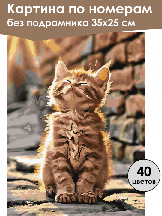 Картина по номерам без подрамника, размер 35х25 см, произведена нами. Она включает 40 оттенков и 2613 контуров, что придаёт ей глубину цвета и плавные переходы. Картина выглядит более ярко и живо. В комплект входит глянцевый лак, которым можно покрыть работу по желанию. Краски качественные, имеют хорошую укрывистость, хватает двух проходов что бы закрасить символы на схеме. Они упакованы герметично, что сохраняет их жидкими. Все необходимые инструменты для начала работы также включены в комплект. Мы не используем экосольвентные чернила, которые содержат свинец и могут быть вредны для здоровья. Наши картины напечатаны безопасными водными пигментными чернилами, обеспечивающими чёткое изображение и легко читаемые обозначения. Холст плотный, имеет мелкую зернистость, легко разглаживается и устойчив к сминанию. Картина поставляется в защищённой бурой коробке. Следует отметить, что картина без подрамника её нельзя натянуть на подрамник из-за узких краёв, она предназначена для оформления в рамочку. Рыжий котёнок сидит на солнечной улице, задрав голову вверх и прищурив глаза, фон размытый, тёплые оттенки создают уютное настроение.