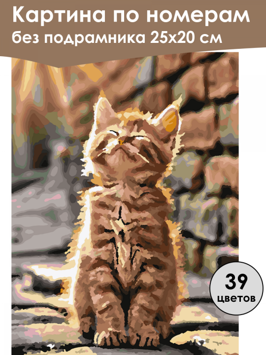 Картина по номерам без подрамника, размер 25х20 см, произведена нами. Она включает 39 оттенков и 1677 контуров, что придаёт ей глубину цвета и плавные переходы. Картина выглядит более ярко и живо. В комплект входит глянцевый лак, которым можно покрыть работу по желанию. Краски качественные, имеют хорошую укрывистость, хватает двух проходов что бы закрасить символы на схеме. Они упакованы герметично, что сохраняет их жидкими. Все необходимые инструменты для начала работы также включены в комплект. Мы не используем экосольвентные чернила, которые содержат свинец и могут быть вредны для здоровья. Наши картины напечатаны безопасными водными пигментными чернилами, обеспечивающими чёткое изображение и легко читаемые обозначения. Холст плотный, имеет мелкую зернистость, легко разглаживается и устойчив к сминанию. Картина поставляется в бурой коробке. Следует отметить, что картина без подрамника её нельзя натянуть на подрамник из-за узких краёв, она предназначена для оформления в рамочку. Рыжий котёнок сидит на солнечной улице, задрав голову вверх и прищурив глаза, фон размытый, тёплые оттенки создают уютное настроение.