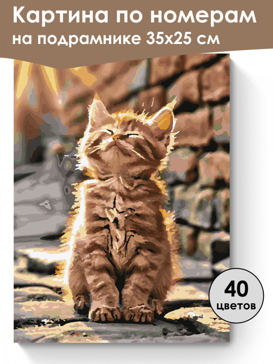 Картина по номерам на подрамнике, размер 35х25 см, произведена нами. Она включает 40 оттенков и 2613 контуров, что придаёт ей глубину цвета и плавные переходы. Картина выглядит более ярко и живо. В комплект входит глянцевый лак, которым можно покрыть работу по желанию. Краски имеют хорошую укрывистость, хватает двух проходов что бы закрасить символы на схеме. Так же они сохраняют текстуру мазков, не растекаясь и не разглаживаясь полностью на холсте. При покрытии глянцевым лаком создаётся эффект приближенный к масляной живописи. Краски упакованы герметично, что сохраняет их жидкими. Все необходимые инструменты для начала работы также включены в комплект, в том числе и крепления на стену. В картине используется крепкий подрамник со специальной вставкой, которая предотвращает провисание холста во время рисования. Это обеспечивает комфортный процесс работы и гарантирует, что холст всегда будет оставаться хорошо натянутым. Мы не используем экосольвентные чернила, которые содержат свинец и могут быть вредны для здоровья. Наши картины напечатаны безопасными водными пигментными чернилами, обеспечивающими чёткое изображение и легко читаемые обозначения. Холст плотный, имеет мелкую зернистость, легко разглаживается и устойчив к сминанию. Картина поставляется в защищённой бурой коробке. Рыжий котёнок сидит на солнечной улице, задрав голову вверх и прищурив глаза, фон размытый, тёплые оттенки создают уютное настроение.