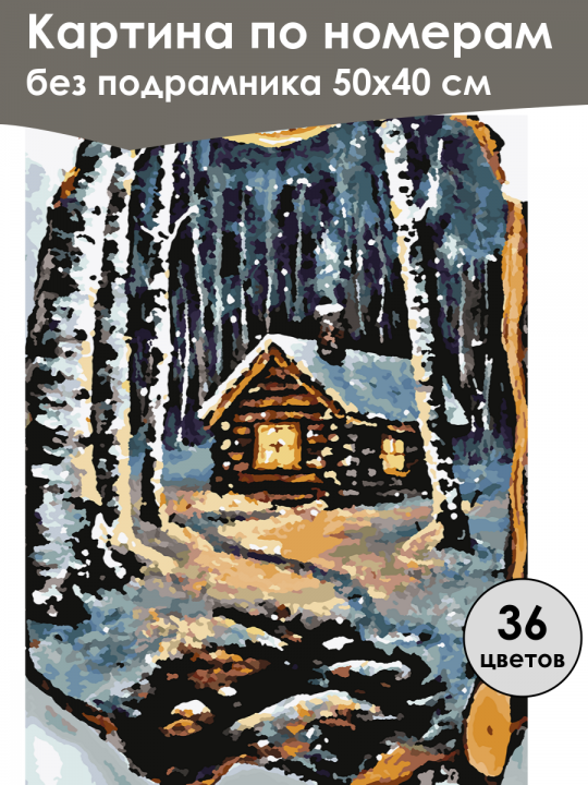 Картина по номерам без подрамника, размер 50х40 см, произведена нами. Она включает 36 оттенков и 3185 контуров, что придаёт ей глубину цвета и плавные переходы. Картина выглядит более ярко и живо. В комплект входит глянцевый лак, которым можно покрыть работу по желанию. Краски имеют хорошую укрывистость, хватает двух проходов что бы закрасить символы на схеме. Так же они сохраняют текстуру мазков, не растекаясь и не разглаживаясь полностью на холсте. При покрытии глянцевым лаком создаётся эффект приближенный к масляной живописи. Краски упакованы герметично, что сохраняет их жидкими. Все необходимые инструменты для начала работы также входят в комплект. Мы не используем экосольвентные чернила, которые содержат свинец и могут быть вредны для здоровья. Наши картины напечатаны безопасными водными пигментными чернилами, обеспечивающими чёткое изображение и легко читаемые обозначения. Холст плотный, имеет мелкую зернистость, легко разглаживается и устойчив к сминанию. Картина поставляется в бурой коробке. Следует отметить, что картина без подрамника её нельзя натянуть на подрамник из-за узких краёв, она предназначена для оформления в рамочку. Зимний пейзаж с маленьким деревянным домиком, вокруг которого стоят заснеженные березы, создавая уютную атмосферу лесного уединения; в доме горит свет, освещая окошки и пространство вокруг, добавляя картине ощущение теплоты и покоя.