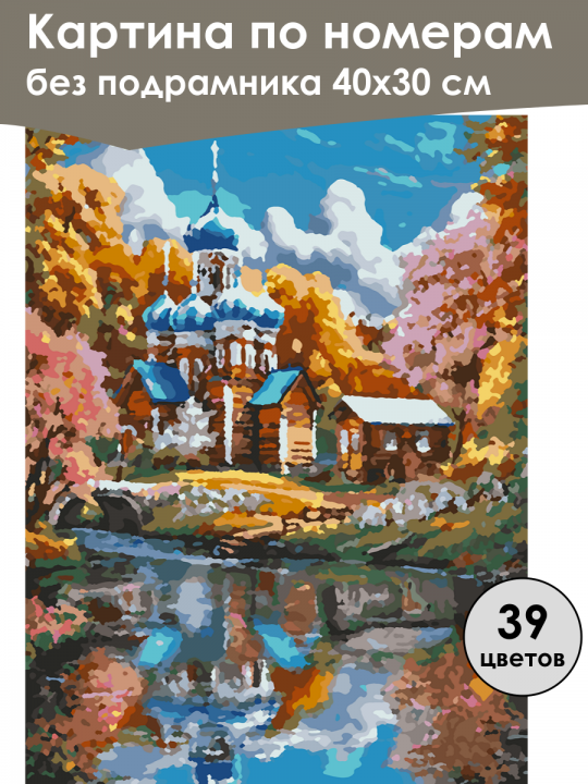 Картина по номерам без подрамника, размер 40х30 см, произведена нами. Она включает 39 оттенков и 2915 контуров, что придаёт ей глубину цвета и плавные переходы. Картина выглядит более ярко и живо. В комплект входит глянцевый лак, которым можно покрыть работу по желанию. Краски имеют хорошую укрывистость, хватает двух проходов что бы закрасить символы на схеме. Так же они сохраняют текстуру мазков, не растекаясь и не разглаживаясь полностью на холсте. При покрытии глянцевым лаком создаётся эффект приближенный к масляной живописи. Краски упакованы герметично, что сохраняет их жидкими. Все необходимые инструменты для начала работы также входят в комплект. Мы не используем экосольвентные чернила, которые содержат свинец и могут быть вредны для здоровья. Наши картины напечатаны безопасными водными пигментными чернилами, обеспечивающими чёткое изображение и легко читаемые обозначения. Холст плотный, имеет мелкую зернистость, легко разглаживается и устойчив к сминанию. Картина поставляется в бурой коробке. Следует отметить, что картина без подрамника её нельзя натянуть на подрамник из-за узких краёв, она предназначена для оформления в рамочку. Яркая радужная сцена с деревянной церковью, увенчанной синими куполами, окружённой разноцветными деревьями и отражающейся в спокойной воде реки, по берегам которой видны мостик и деревянные дома.