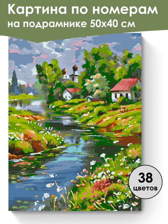 Картина по номерам на подрамнике, размер 50х40 см, произведена нами. Она включает 38 оттенков и 2966 контуров, что придаёт ей глубину цвета и плавные переходы. Картина выглядит более ярко и живо. В комплект входит глянцевый лак, которым можно покрыть работу по желанию. Краски имеют хорошую укрывистость, хватает двух проходов что бы закрасить символы на схеме. Так же они сохраняют текстуру мазков, не растекаясь и не разглаживаясь полностью на холсте. При покрытии глянцевым лаком создаётся эффект приближенный к масляной живописи. Краски упакованы герметично, что сохраняет их жидкими. Все необходимые инструменты для начала работы также включены в комплект, в том числе и крепления на стену. В картине используется крепкий подрамник со специальной вставкой, которая предотвращает провисание холста во время рисования. Это обеспечивает комфортный процесс работы и гарантирует, что холст всегда будет оставаться хорошо натянутым. Мы не используем экосольвентные чернила, которые содержат свинец и могут быть вредны для здоровья. Наши картины напечатаны безопасными водными пигментными чернилами, обеспечивающими чёткое изображение и легко читаемые обозначения. Холст плотный, имеет мелкую зернистость, легко разглаживается и устойчив к сминанию. Картина поставляется в защищённой бурой коробке. Живописная сельская сцена: извивающаяся река с отражением неба в её водах, окружённая пышными кустами и цветущими лугами, ведущими к небольшому белому дому с красной крышей и православному храму с куполами на заднем плане, обрамлённым зелёными деревьями и под розовато-голубыми облаками на фоне.