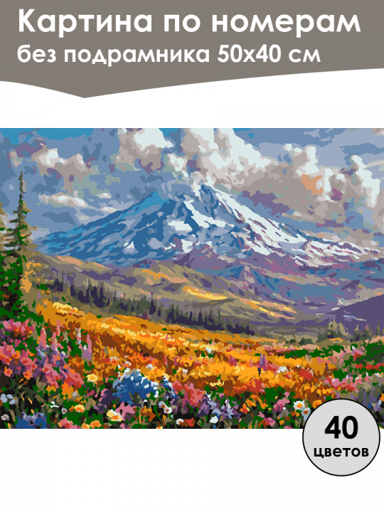 Картина по номерам без подрамника, размер 50х40 см, произведена нами. Она включает 40 оттенков и 3142 контуров, что придаёт ей глубину цвета и плавные переходы. Картина выглядит более ярко и живо. В комплект входит глянцевый лак, которым можно покрыть работу по желанию. Краски имеют хорошую укрывистость, хватает двух проходов что бы закрасить символы на схеме. Так же они сохраняют текстуру мазков, не растекаясь и не разглаживаясь полностью на холсте. При покрытии глянцевым лаком создаётся эффект приближенный к масляной живописи. Краски упакованы герметично, что сохраняет их жидкими. Все необходимые инструменты для начала работы также входят в комплект. Мы не используем экосольвентные чернила, которые содержат свинец и могут быть вредны для здоровья. Наши картины напечатаны безопасными водными пигментными чернилами, обеспечивающими чёткое изображение и легко читаемые обозначения. Холст плотный, имеет мелкую зернистость, легко разглаживается и устойчив к сминанию. Картина поставляется в бурой коробке. Следует отметить, что картина без подрамника её нельзя натянуть на подрамник из-за узких краёв, она предназначена для оформления в рамочку. Горный пейзаж с заснеженной вершиной на фоне, под которым простирается поле ярких цветущих лугов, разделённых полосами зелени и золотистыми оттенками трав, сочетающимися с насыщенными синими и фиолетовыми тенями гор, с клубящимися облаками над головой.