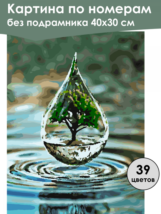Картина по номерам без подрамника, размер 40х30 см, произведена нами. Она включает 39 оттенков и 2002 контуров, что придаёт ей глубину цвета и плавные переходы. Картина выглядит более ярко и живо. В комплект входит глянцевый лак, которым можно покрыть работу по желанию. Краски имеют хорошую укрывистость, хватает двух проходов что бы закрасить символы на схеме. Так же они сохраняют текстуру мазков, не растекаясь и не разглаживаясь полностью на холсте. При покрытии глянцевым лаком создаётся эффект приближенный к масляной живописи. Краски упакованы герметично, что сохраняет их жидкими. Все необходимые инструменты для начала работы также входят в комплект. Мы не используем экосольвентные чернила, которые содержат свинец и могут быть вредны для здоровья. Наши картины напечатаны безопасными водными пигментными чернилами, обеспечивающими чёткое изображение и легко читаемые обозначения. Холст плотный, имеет мелкую зернистость, легко разглаживается и устойчив к сминанию. Картина поставляется в бурой коробке. Следует отметить, что картина без подрамника её нельзя натянуть на подрамник из-за узких краёв, она предназначена для оформления в рамочку. Художественная композиция: дерево растёт внутри капли воды, плавающей над гладью водной поверхности, создавая эффектные концентрические круги; фоновая гамма состоит из плавных зелёных и коричневых оттенков, подчеркивая гармонию природы.
