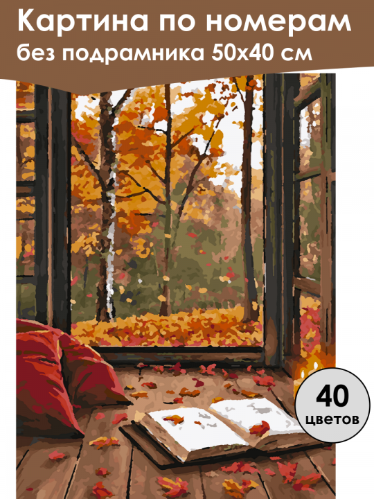 Картина по номерам без подрамника, размер 50х40 см, произведена нами. Она включает 40 оттенков и 3218 контуров, что придаёт ей глубину цвета и плавные переходы. Картина выглядит более ярко и живо. В комплект входит глянцевый лак, которым можно покрыть работу по желанию. Краски имеют хорошую укрывистость, хватает двух проходов что бы закрасить символы на схеме. Так же они сохраняют текстуру мазков, не растекаясь и не разглаживаясь полностью на холсте. При покрытии глянцевым лаком создаётся эффект приближенный к масляной живописи. Краски упакованы герметично, что сохраняет их жидкими. Все необходимые инструменты для начала работы также входят в комплект. Мы не используем экосольвентные чернила, которые содержат свинец и могут быть вредны для здоровья. Наши картины напечатаны безопасными водными пигментными чернилами, обеспечивающими чёткое изображение и легко читаемые обозначения. Холст плотный, имеет мелкую зернистость, легко разглаживается и устойчив к сминанию. Картина поставляется в бурой коробке. Следует отметить, что картина без подрамника её нельзя натянуть на подрамник из-за узких краёв, она предназначена для оформления в рамочку. Уютный уголок у открытого окна, сквозь которое виднеется осенний пейзаж с деревьями в золотисто-оранжевой листве, внутри на дощатом полу лежит раскрытая книга, вокруг неё разбросаны осенние листья, рядом горят две свечи и лежат красные подушки, создавая атмосферу тепла и уюта.