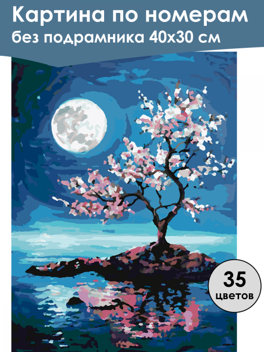 Картина по номерам без подрамника, размер 40х30 см, произведена нами. Она включает 35 оттенков и 1938 контуров, что придаёт ей глубину цвета и плавные переходы. Картина выглядит более ярко и живо. В комплект входит глянцевый лак, которым можно покрыть работу по желанию. Краски имеют хорошую укрывистость, хватает двух проходов что бы закрасить символы на схеме. Так же они сохраняют текстуру мазков, не растекаясь и не разглаживаясь полностью на холсте. При покрытии глянцевым лаком создаётся эффект приближенный к масляной живописи. Краски упакованы герметично, что сохраняет их жидкими. Все необходимые инструменты для начала работы также входят в комплект. Мы не используем экосольвентные чернила, которые содержат свинец и могут быть вредны для здоровья. Наши картины напечатаны безопасными водными пигментными чернилами, обеспечивающими чёткое изображение и легко читаемые обозначения. Холст плотный, имеет мелкую зернистость, легко разглаживается и устойчив к сминанию. Картина поставляется в бурой коробке. Следует отметить, что картина без подрамника её нельзя натянуть на подрамник из-за узких краёв, она предназначена для оформления в рамочку. Живописная сцена с цветущим деревом на небольшом островке, окружённым водой, в лучах полной луны, отражающейся на поверхности воды; небо насыщенного синего оттенка с лёгкими облаками, а листья дерева нежно-розовые и белые, создавая атмосферу ночной гармонии и спокойствия.