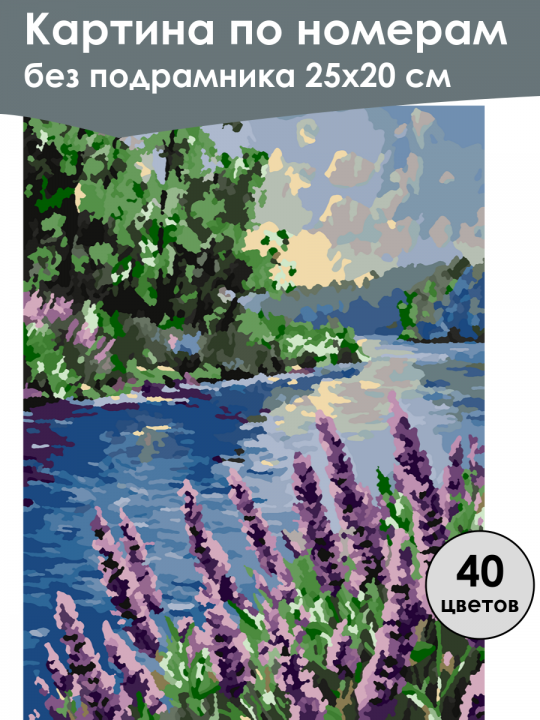 Картина по номерам без подрамника, размер 25х20 см, произведена нами. Она включает 40 оттенков и 1761 контуров, что придаёт ей глубину цвета и плавные переходы. Картина выглядит более ярко и живо. В комплект входит глянцевый лак, которым можно покрыть работу по желанию. Краски качественные, имеют хорошую укрывистость, хватает двух проходов что бы закрасить символы на схеме. Они упакованы герметично, что сохраняет их жидкими. Все необходимые инструменты для начала работы также включены в комплект. Мы не используем экосольвентные чернила, которые содержат свинец и могут быть вредны для здоровья. Наши картины напечатаны безопасными водными пигментными чернилами, обеспечивающими чёткое изображение и легко читаемые обозначения. Холст плотный, имеет мелкую зернистость, легко разглаживается и устойчив к сминанию. Картина поставляется в бурой коробке. Следует отметить, что картина без подрамника её нельзя натянуть на подрамник из-за узких краёв, она предназначена для оформления в рамочку. Пейзаж с рекой, окружённой густыми лесами, солнечное небо с облаками отражается в воде, на переднем плане справа расположены яркие фиолетовые цветы.