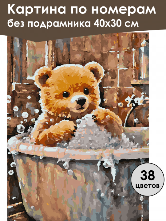 Картина по номерам без подрамника, размер 40х30 см, произведена нами. Она включает 38 оттенков и 2935 контуров, что придаёт ей глубину цвета и плавные переходы. Картина выглядит более ярко и живо. В комплект входит глянцевый лак, которым можно покрыть работу по желанию. Краски имеют хорошую укрывистость, хватает двух проходов что бы закрасить символы на схеме. Так же они сохраняют текстуру мазков, не растекаясь и не разглаживаясь полностью на холсте. При покрытии глянцевым лаком создаётся эффект приближенный к масляной живописи. Краски упакованы герметично, что сохраняет их жидкими. Все необходимые инструменты для начала работы также входят в комплект. Мы не используем экосольвентные чернила, которые содержат свинец и могут быть вредны для здоровья. Наши картины напечатаны безопасными водными пигментными чернилами, обеспечивающими чёткое изображение и легко читаемые обозначения. Холст плотный, имеет мелкую зернистость, легко разглаживается и устойчив к сминанию. Картина поставляется в бурой коробке. Следует отметить, что картина без подрамника её нельзя натянуть на подрамник из-за узких краёв, она предназначена для оформления в рамочку. Плюшевый медвежонок сидит в деревянной ванне, наполненной мыльной пеной, вокруг летают пузырьки, интерьер фонового помещения выполнен в тёплых коричневых тонах.