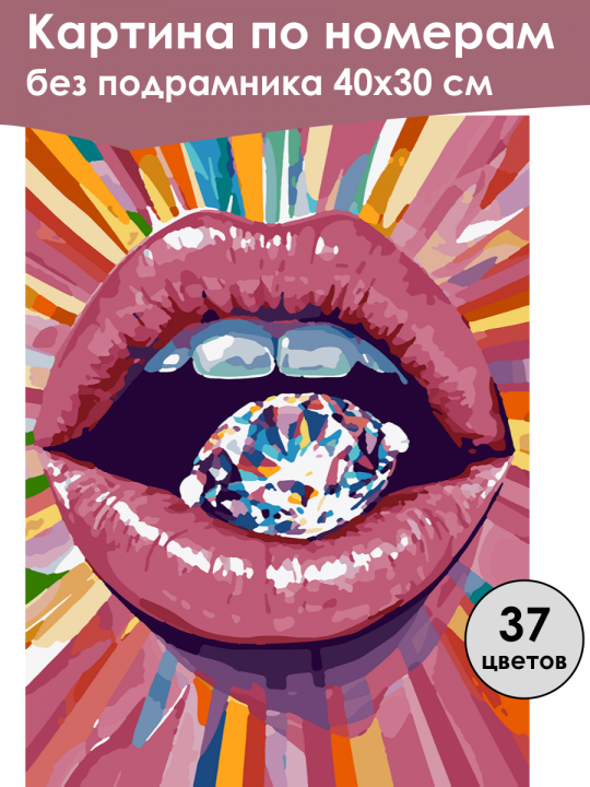 Картина по номерам без подрамника, размер 40х30 см, произведена нами. Она включает 37 оттенков и 976 контуров, что придаёт ей глубину цвета и плавные переходы. Картина выглядит более ярко и живо. В комплект входит глянцевый лак, которым можно покрыть работу по желанию. Краски имеют хорошую укрывистость, хватает двух проходов что бы закрасить символы на схеме. Так же они сохраняют текстуру мазков, не растекаясь и не разглаживаясь полностью на холсте. При покрытии глянцевым лаком создаётся эффект приближенный к масляной живописи. Краски упакованы герметично, что сохраняет их жидкими. Все необходимые инструменты для начала работы также входят в комплект. Мы не используем экосольвентные чернила, которые содержат свинец и могут быть вредны для здоровья. Наши картины напечатаны безопасными водными пигментными чернилами, обеспечивающими чёткое изображение и легко читаемые обозначения. Холст плотный, имеет мелкую зернистость, легко разглаживается и устойчив к сминанию. Картина поставляется в бурой коробке. Следует отметить, что картина без подрамника её нельзя натянуть на подрамник из-за узких краёв, она предназначена для оформления в рамочку. Яркое и красочное поп-арт изображение: крупным планом изображены губы в насыщенном розовом оттенке, между ними блестящий бриллиант, а фон состоит из разноцветных лучей, создающих динамичный и современный эффект.